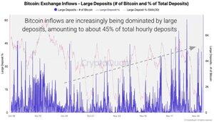 Suuret talletukset (100+ BTC) muodostavat nyt 45 % kaikista sisäänvirtauksista, ja 21. marraskuuta ne saavuttivat 7K BTC:n.