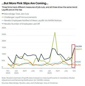 MacroEdgen seuraamat työpaikkojen vähennykset nousivat +70 609 kuukauden kuluttua lokakuussa 154 559:ään, mikä on korkein lukema vähintään kahteen vuoteen.