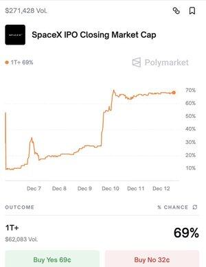 69 % mahdollisuus 1 biljoonan dollarin+ SpaceX:n listautumiseen.