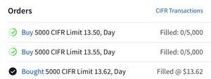 Per CIFR, ho effettuato 3 ordini. Solo 1 è stato eseguito, ma è stato un buon eseguito.