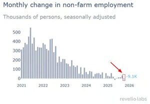 代替データは、米国の雇用市場の悪化が進んでいることを裏付けています。 Revelioは、10月の米国の非農業部門雇用は-9,100人減少し、少なくとも5年間で2番目に大きな減少となったと推定しています。 Revelio は、企業のキャリア サイト、LinkedIn、Indeed、人材派遣会社からのデータを集約します。 10月の減少は政府の雇用減少によるもので、民間部門のわずかな利益を上回った。 一方、9月の数字は-27,100人大幅に下方修正され、+33,000になりました。 これにより、6月、7月、8月、9月の合計は-142,500になりました。 労働市場の亀裂が広がりつつあります。