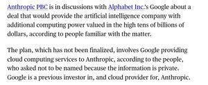 Bloomberg rapporterer at Anthropic for tiden er i beregningsdiskusjoner med Google i en avtale verdsatt til «høye titalls milliarder».