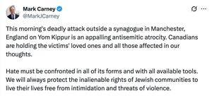 🇨🇦🇬🇧 PRIMEIRO-MINISTRO DO CANADÁ, CARNEY: ATAQUE À SINAGOGA DE MANCHESTER É UMA "ATROCIDADE ANTISSEMITA TERRÍVEL"