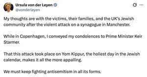 🇪🇺🇬🇧 CHEFE DA UE, VON DER LEYEN: ATAQUE À SINAGOGA DE MANCHESTER É "AINDA MAIS TERRÍVEL" NO YOM KIPPUR
