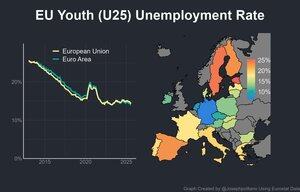 O desemprego juvenil da zona do euro permanece em 14%, os níveis mais baixos já registrados, enquanto o desemprego juvenil mais amplo da UE é de 14,6%.