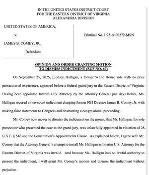 En federal domare avvisade just James Comeys fall utan fördom på grund av Lindsey Halligans olagliga utnämning.