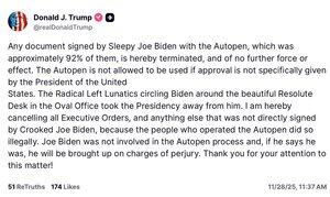 Trump: Jag upphäver härmed alla exekutiva order och allt annat som inte direkt undertecknats av Crooked Joe Biden, eftersom de som drev Autopen gjorde det olagligt. Joe Biden var inte involverad i Autopen-processen och om han säger att han var det, kommer han att åtalas för mened.