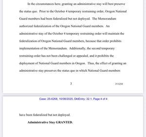9-й окружний апеляційний суд тимчасово зупинив дію наказу судді Іммергута, який блокує федералізацію Національної гвардії штату Орегон. Але другий наказ судді — про заборону розгортання федералізованих військ у Портленді — залишається в силі.