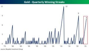 Giá vàng hiện đã ghi nhận mức tăng liên tiếp quý thứ 8, chuỗi dài thứ ba trong lịch sử.