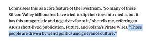 沒有人閱讀 Business Insider,所以我不幸錯過了他們幾週前引用泰勒·洛倫茲(Taylor Lorenz)批評我「奇怪的政治」的話,但順便說一下,當被問到她對布萊恩·湯普森(Brian Thompson)被刺殺的感受時,她說了「快樂」。所以我認為這是一個極高的讚美。